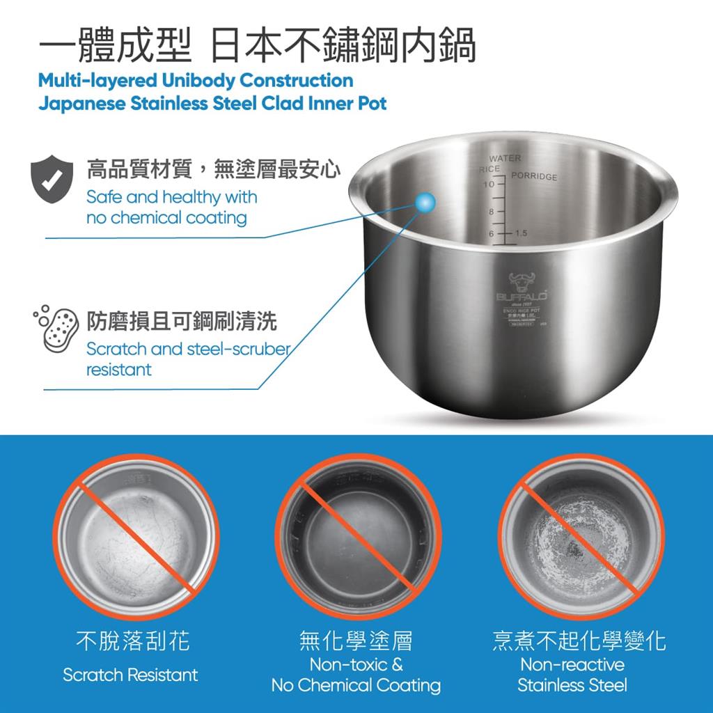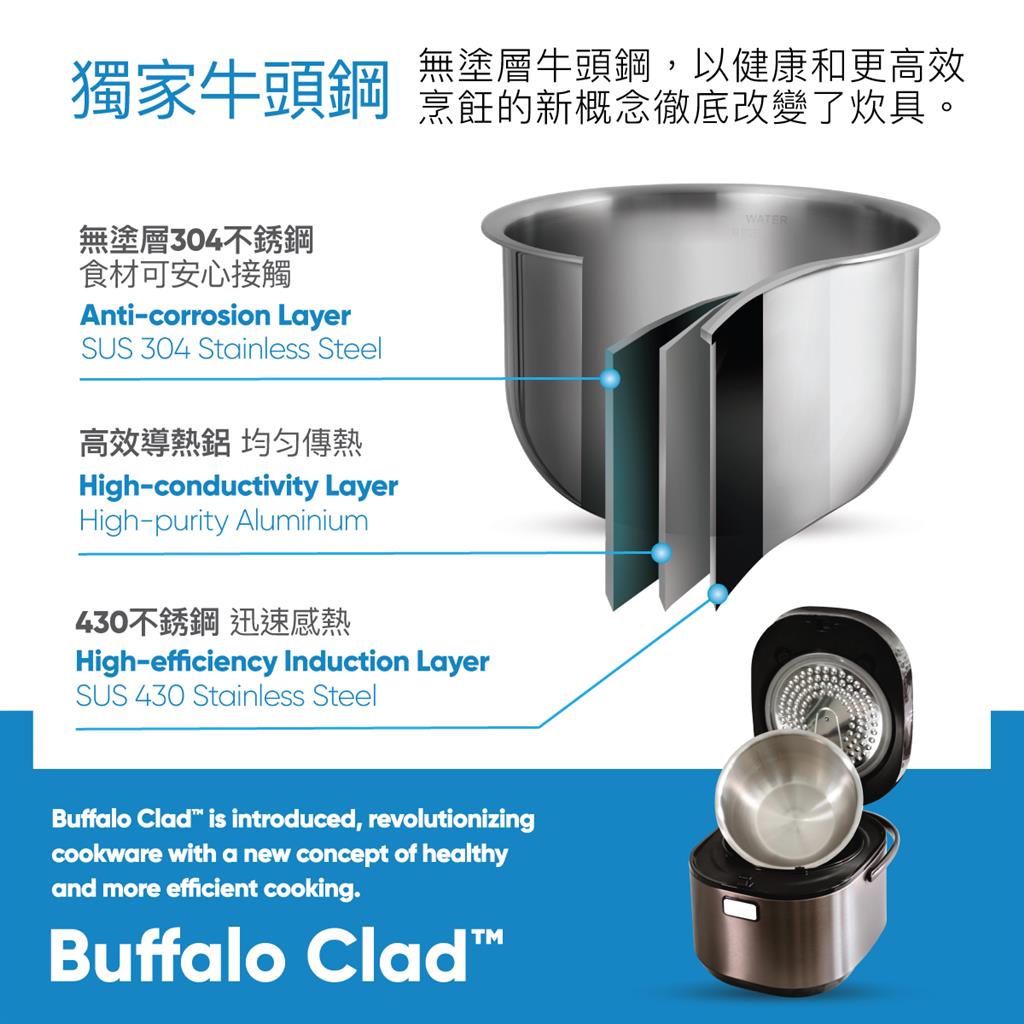Patented Buffalo Clad inner pot is made of high-quality Japanese cladding materials. It has no chemical coating, great heat retention, and withstands the toughest acids such as alkali from wear and tear. Program 24 hours ahead and time your feasts perfectly. Feels like a Michelin-starred chef with Buffalo IH Smart Cooker's smart panel and Micom temperature control.