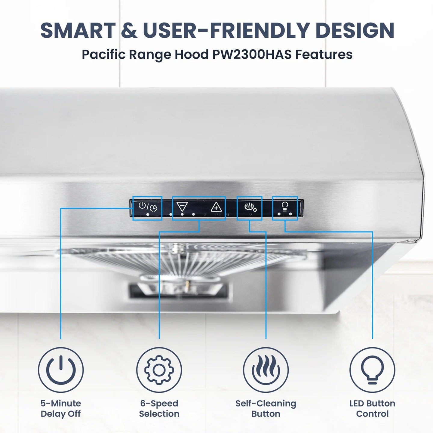 Filterless & self-cleaning design uses centrifugal force to separate the grease, residue and force it under pressure by spraying water, no filter is needed as to avoid fire hazardous, eco-friendly and safe to your family.